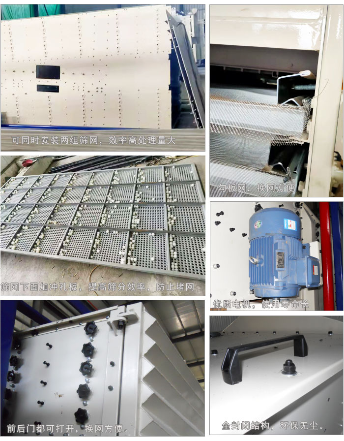 機(jī)制砂的原料為各種石塊,機(jī)制砂是指經(jīng)過一系列加工工藝形成的粒徑小于4.75mm的巖石顆粒。機(jī)制砂制備過程中常見的篩分粒度為5mm(4目)、2.36mm、1.2mm、0.6mm,部分特殊砂漿的精細(xì)度會(huì)更細(xì),篩分精度需求為0.3mm、0.15mm、0.075mm。方形搖擺篩可同時(shí)安裝1-6層篩網(wǎng),篩箱前后都可以打開,換網(wǎng)非常方便。而且篩網(wǎng)下面加清網(wǎng)裝置防止堵網(wǎng)。